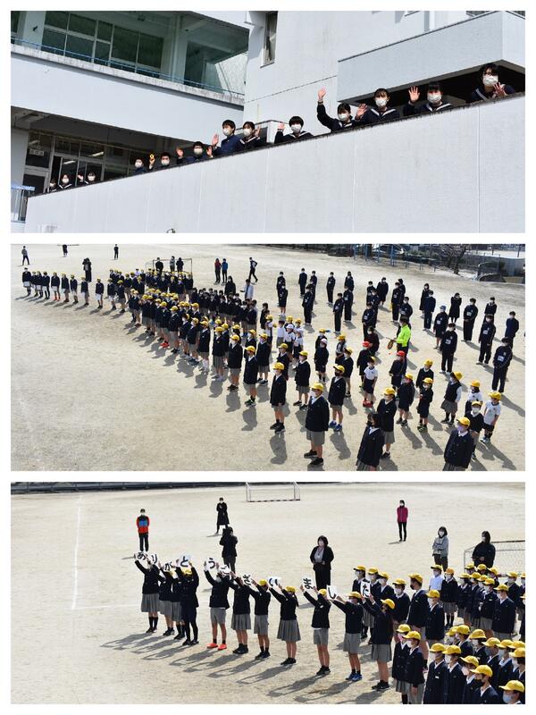 4日(木)の昼休み時間、中学校の運動場に向かうと、3年生の皆さん他、先生方、そして在校生の皆さん全員で出迎えていただきました。