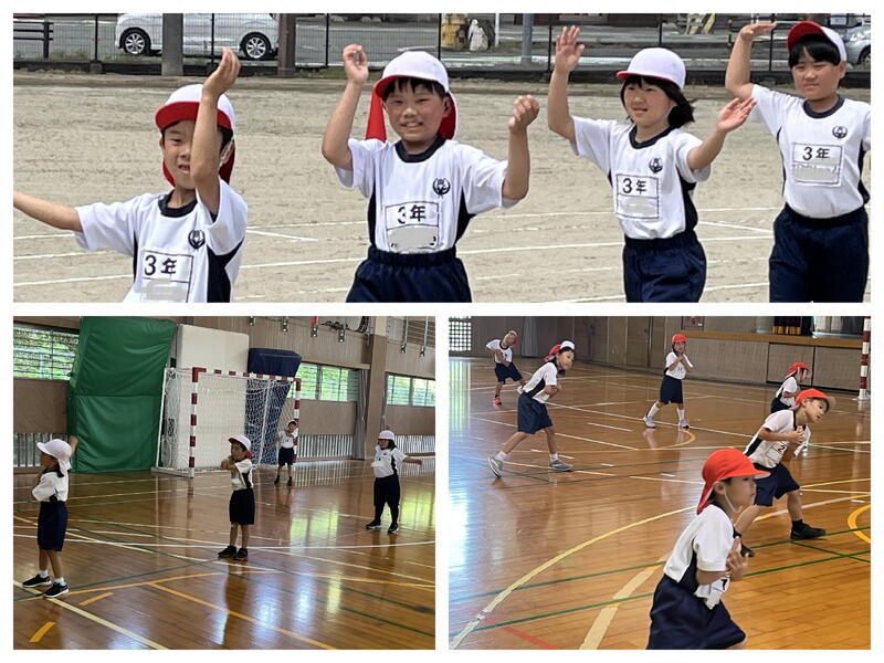 今日は予行練習を行いました。とてもよい天気で、暑い中でしたが、元気いっぱいに声を出し、楽しそうに応援をしていました。そして、もしも雨が降ったときに備えて、中学校の体育館でもダンスの練習を行いました。いつもとは違う体育館での練習です。みんなとても真剣に練習をしていました。今日は5・6年生に感心しました。中学校の体育館で、高学年の児童が表現の練習をした後で、自分たちで整列して、中学校の廊下を並んで歩き、小学校へ戻っていく姿がありました。途中、中学校の先生方にも元気に挨拶をしながら歩いていました。運動会の練習で、集団行動や挨拶、きびきびとした動きなどの力がついてきていることを感じます。いよいよ運動会まであと少し。当日は、皆で盛り上がりましょう!