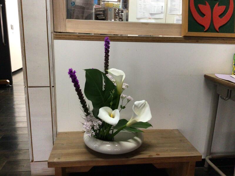 原地区の古田様が小学校の玄関に、毎月2回、生花を飾ってくださっています。季節の花や珍しい花をいけてくださいます。心が豊かになります。いつもありがとうございます。