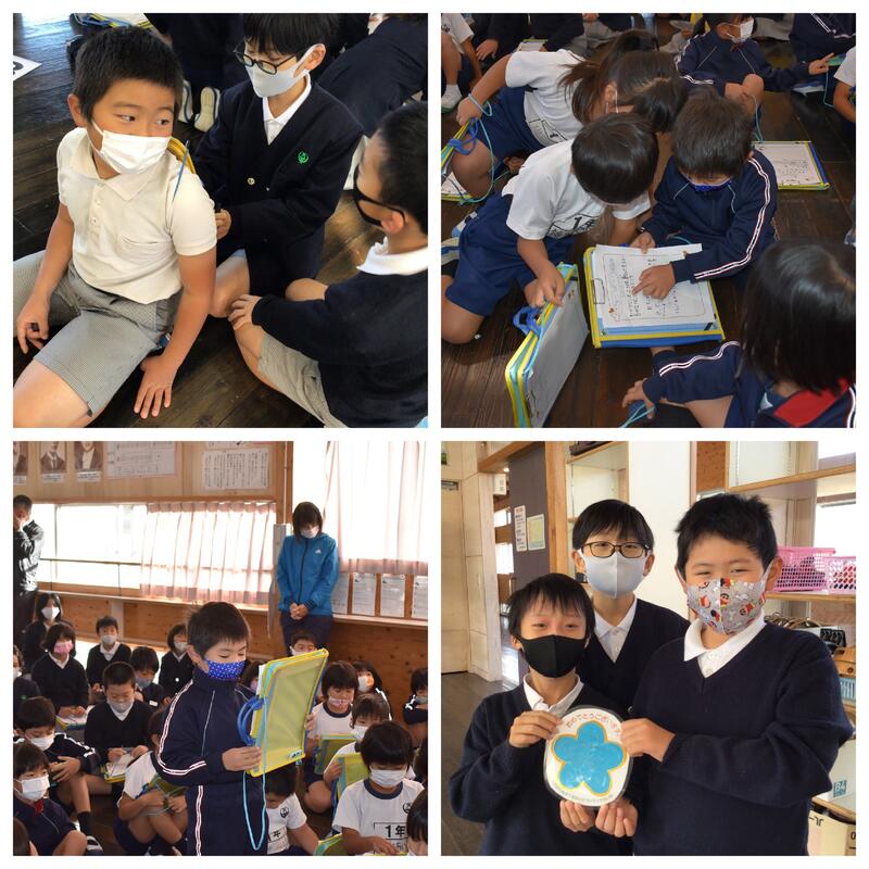 次に、縦割り班に分かれ、探検バックを背負ってカメさんポーズをとっている子に、その子の良さや頑張り、日頃の感謝のメッセージを書き込みました。メッセージカードは背中にあるため、自分のことについて何が書いてあるかわかりません。みんなが書き終えると一斉に読みあっていました。日頃気付いていない自分の良さを確かめることができ、みんなとっても嬉しそう。その嬉しさを発表し合って会は終了しました。