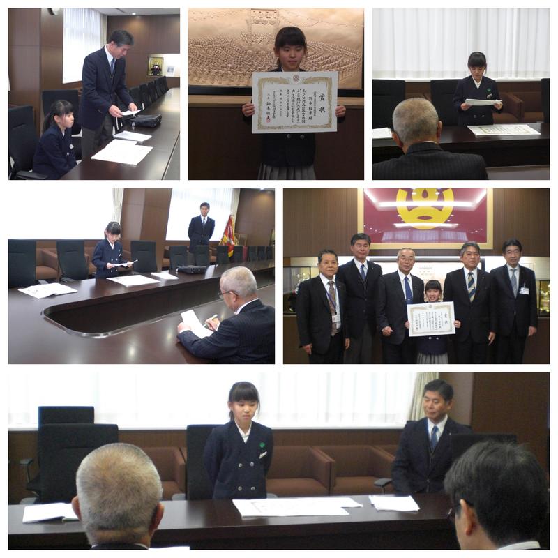 1月28日(火)、公益社団法人「小さな親切」運動本部主催、第44回「小さな親切」作文コンクールにおいて、全国表彰を受けた4年生女子児童が、山鹿市長を表敬訪問しました。