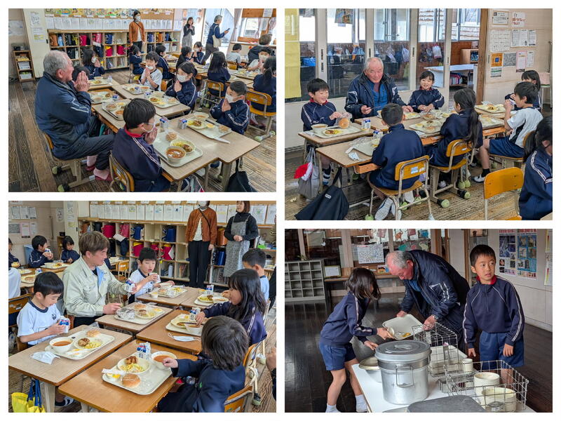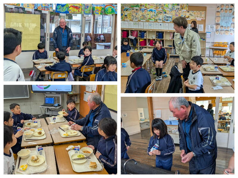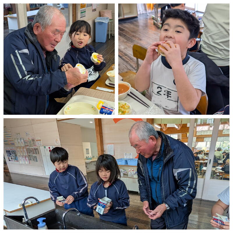 1月20日(火)いつも給食の食材を提供してくださっている元田工務店の元田会長と元田社長、そして山鹿市教育委員会から北本首席教育審議員が来校され、給食を一緒にいただきました。今日の献立は、元田工務店様を通じて、丸信産業様より無償で提供していただいた馬肉ミンチをたっぷり使った「馬肉コロッケ」とゆでキャベツをパンに挟んで食べる「セルフコロッケバーガー」です。給食の先生方が手作りでコロッケを作ってくださいました。いつもポスターのお写真で拝見していた元田会長と元田社長にお会いしてたくさんお話しできました。今回は2年生と一緒に食べていただきました。「いただきます」から「ごちそうさま」まで、子どもたちといっしょです。牛乳パックの開け方、食器の片付け方は2年生が説明してくれました。元田会長も元田社長も子どもたちといろんな話をされながら笑顔で過ごしてくださいました。いつも食のサポートありがとうございます。
