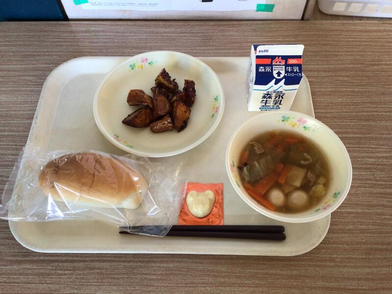 牛乳、コッペパン、八宝菜、大学芋、チーズ