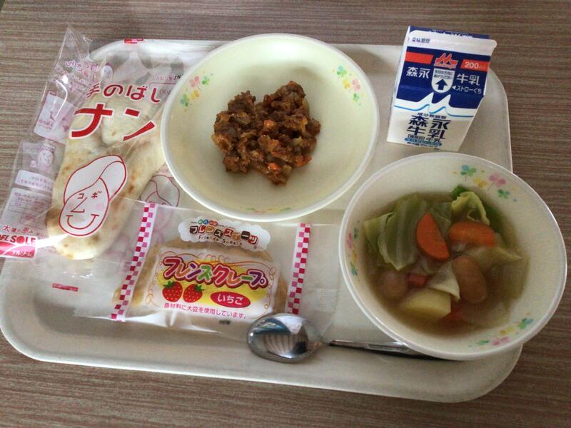 牛乳、ナン、キーマカレー、野菜のスープ煮、クレープ