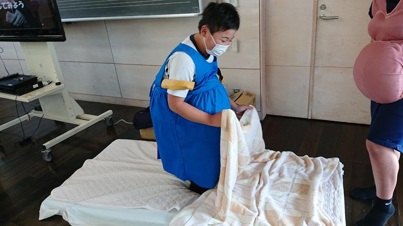 妊婦体験では赤ちゃんがお腹にいる時の、大変さを感じたようです。『こんなに重いんだあ』、『布団に横になるのも大変…。』と驚いていました。