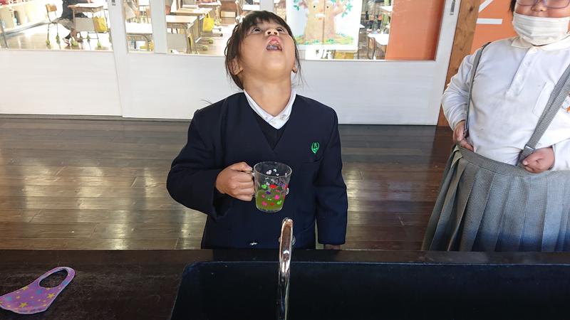 ⇩外遊びや体育のあと、給食前に自分で考えてうがいをしてくれています。