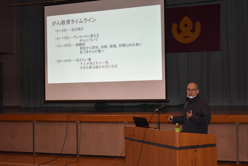 先週18日(金)、鹿北中学校体育館にて小学5,6年生と中学生に向けて『がん教育講演会』が開催されました。