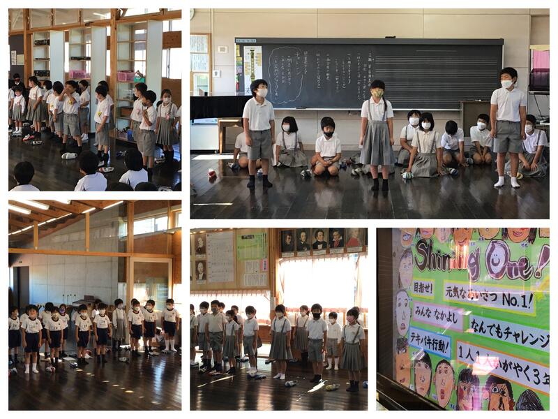 Ⅰ期のリーダーは4年生です。4年生の司会進行で、期集会は進められました。今年度の児童会目標である「チャレンジ」具体的達成目標の〇明るいあいさつ〇みんなが笑顔〇一人一人がいっしょうけんめいを受けて、各学年の学級目標が発表されました。