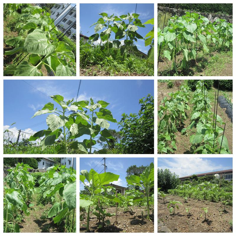 前回の紹介は、5月13日でした。校門前と第2グラウンドのひまわりが、2週間余りで写真のように成長しています。後から芽吹いたものが分からないほど、順調に成長しています。