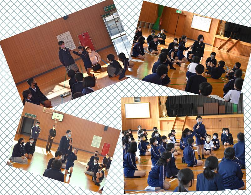 まずはじめに、子どもたちを代表して1年生、古川さん、4年生、藤本さん、6年生、竹村さんの3人が、2学期を振り返り、作文発表を行いました。それぞれ、自分の視点で感想を述べることができ、みんなが聞き入っていました。