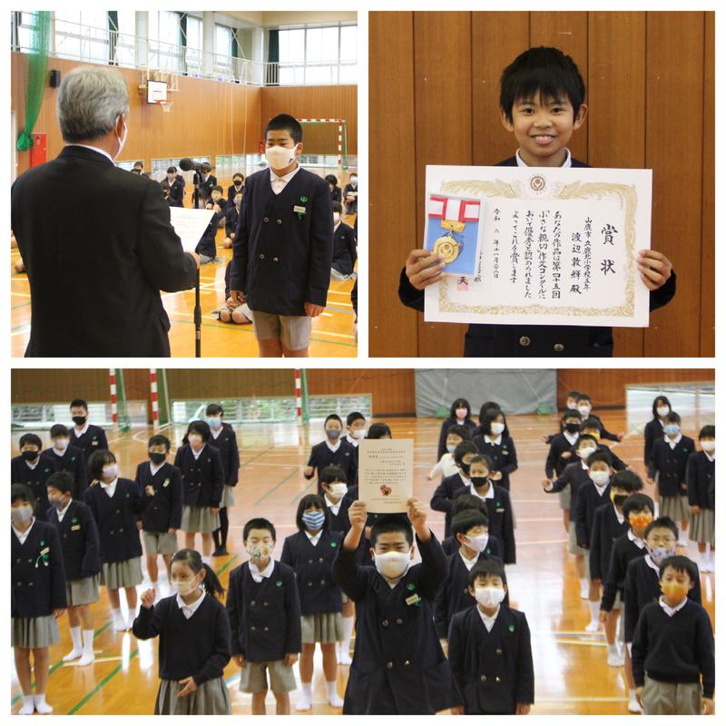 1つ目は、「小さな親切作文コンクール」。5年生の渡辺君が、応募総数23,704点の中から、全国優秀賞を受賞しました。昨年の野中さんに続き、2年連続の快挙です。タイトルは「みんなに役立つ親切」。この作品は、熊本シティエフエム(FM891)で、1月4日(月)と、3月2日(火)のそれぞれ午前7時30分頃から放送されます。多くの皆様にお聞きいただくようお願いいたします。