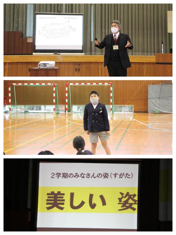 つぎは、校長講話。2学期の子どもたちが成長する姿を写真で振り返りながら、どんな点がすばらしかったか、わかりやすく解説が行われました。「〇〇姿」の空欄にはどんな言葉が入るか、子どもたちへの質問が行われ、「頑張る姿」「協力する姿」「元気な姿」など、子どもたちからたくさんの発表がありました。それらを総合すると、「美しい姿」が、たくさん認められた2学期だったとの総括が行われました。