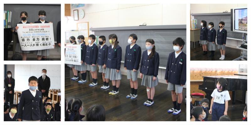 まず、新児童会による来年度の児童会テーマの発表と新委員長のあいさつでした。来年度の児童会合言葉は、鹿北中生徒会と共に考えた「挑戦と素敵な失敗(Try and Error)」です。また、その合言葉を受けた児童会テーマは、「協力 全力 挑戦!一人一人が輝く鹿北小」です。「失敗を恐れず、みんなで協力しながら、全力で、挑戦し、みんなが輝く鹿北小にしよう」という意味が込められていいるようです。また、新委員長になった子どもたちは、自分たちの委員会で活発な活動をするために、熱くその思いを語っていました。