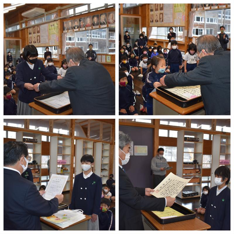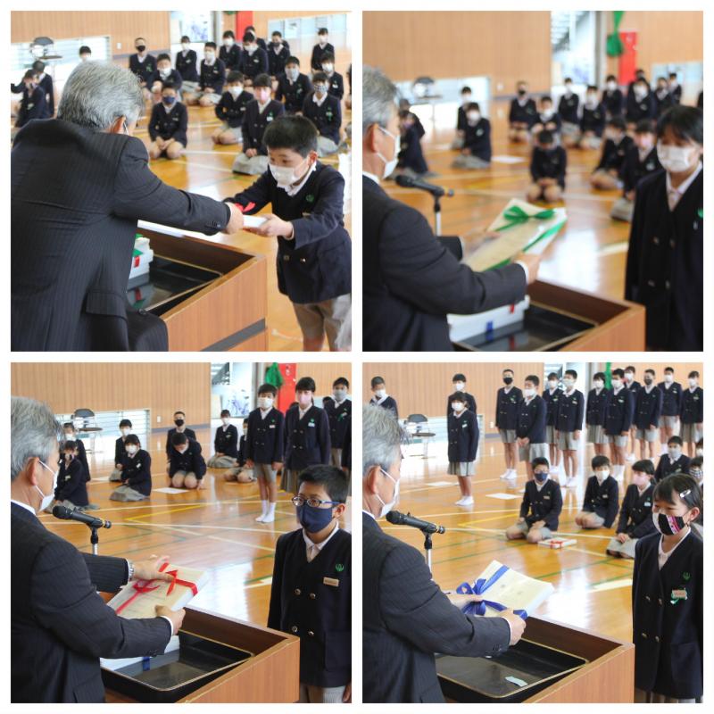 まず、会に先立ち表彰式。作文、図画のコンクールに入賞した子やあいさつを頑張った子への感謝状などが授与されました。