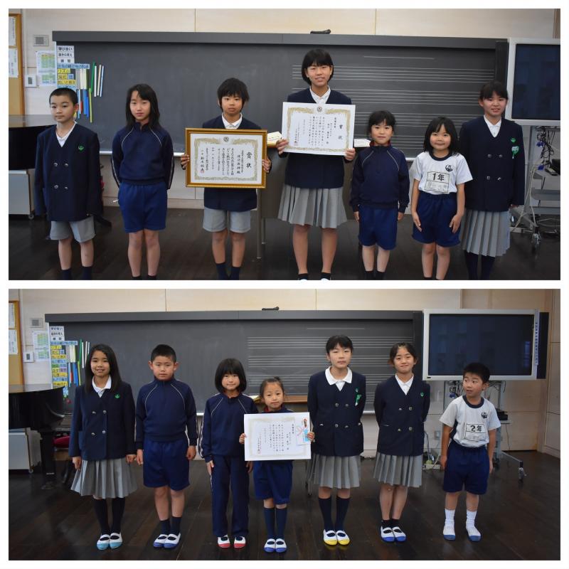 各代表者が賞状を受け取ると、緊張の中にも嬉しさがこみあげてきているようでした。特に「青少年読書感想文全国コンクール」では、5年生の渡辺君の作品が、全国200万点の中から入賞するという快挙を成し遂げました。