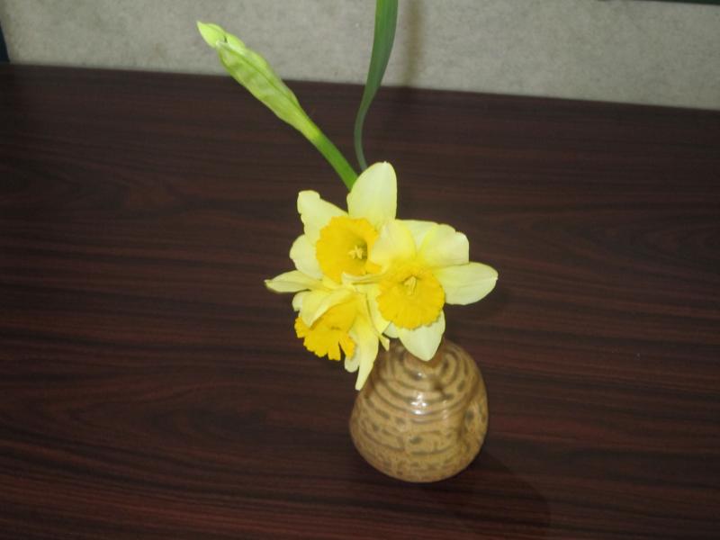あいさつ運動後、校長室前に紙袋が置かれているのに気づきました。中を確認してみると3輪のかわいらしい水仙の花が入れてあります。早速、1輪挿し風の花びんを使い飾りました。