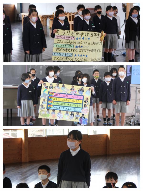 2つの発表をみな真剣に聞いていました。「新しい児童会テーマのもと新委員長に頑張ってほしい。」「野菜の水かけに行ったとき、せせらぎの木をながめたい。」など、たくさんの感想が寄せられました。