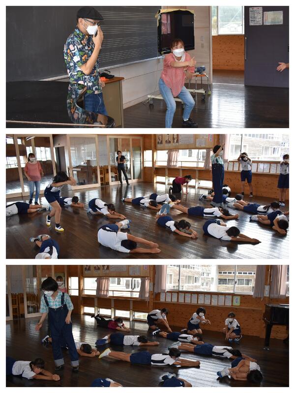 5年生は、劇団「転回者」皆様を講師に、演劇活動をつうじた表現力向上の学習が行われました。劇団員の言葉や合図で子どもたちはミミズになったり蛇になったりと楽しそうに自分の思いを体で表現していました。