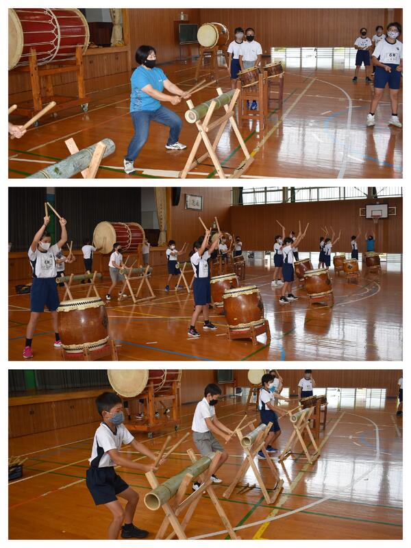 6年生は、鹿北太鼓の練習。例年お世話になっている中満様に加え、鹿子木様の協力を得て、太鼓の叩き方の練習を行いました。子どもたちは連続して叩き続けることに苦労しており、手に豆を作った子もいたようです。今年度は、感染症予防のため一つの太鼓を二人でたたくことができません。そこで、太鼓不足を補うため、中満様が竹太鼓を準備してくださいました。