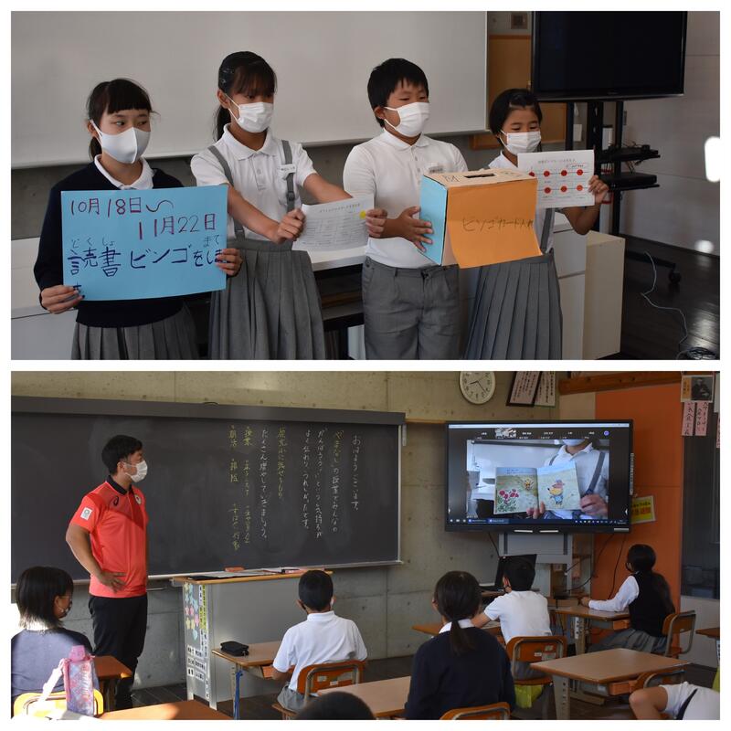 15日(金)は、朝の児童集会で図書委員会の子どもたちが図書室の使い方や、読書ビンゴ大会の説明、そして絵本の読み聞かせをオンラインで発表してくれました。