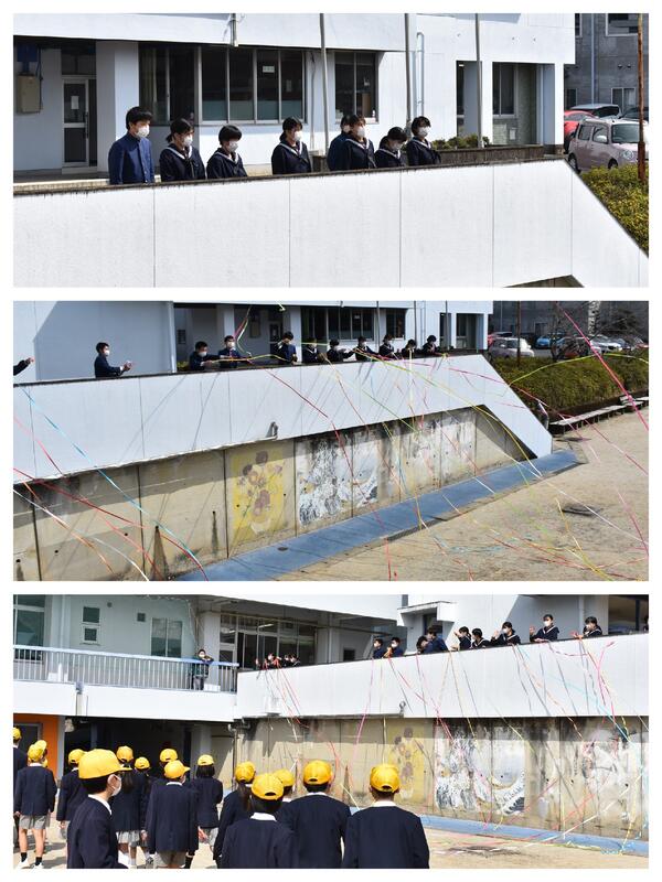 学年ごとにお礼の言葉を述べ、全員で「ありがとうございました」とあいさつすると、3年生の皆さんから紙テープが投げられました。その光景は、港を離れ旅立つ際のお別れのようでした。