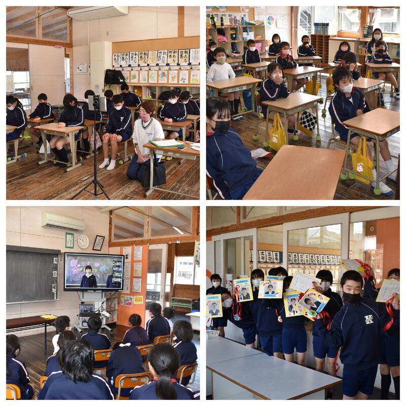 まず、送る会、新型コロナウイルス感染症予防のため、リモートで開催となりました。会に先立ち、今日は3月11日、東日本大震災から11年。全員で黙とうをささげました。その後、学年ごとにあらかじめ収録していた動画を配信しました。最後に手作りの感謝状とメダルを贈られると6年生のみんなも大変喜んでいたようです。