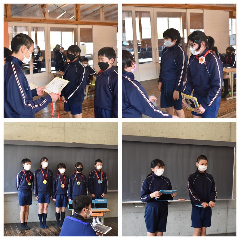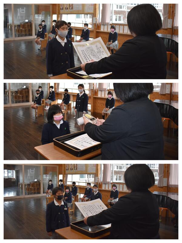 4日(金)の全校集会は、表彰式を行いました。表彰対象は、県文集「ゆめ」、県読書感想画コンクール、税に関する絵葉書コンクールの入選者です。代表者は、皆、凛とした姿で、表彰状を受け取っていました。