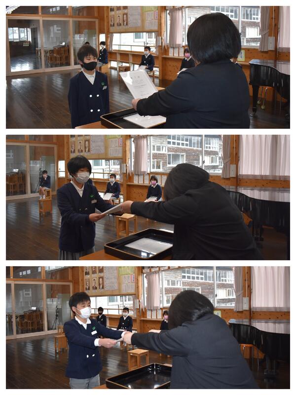 式に先立ち、本年度最後の表彰式。代表者3人が賞状を受け取りました。