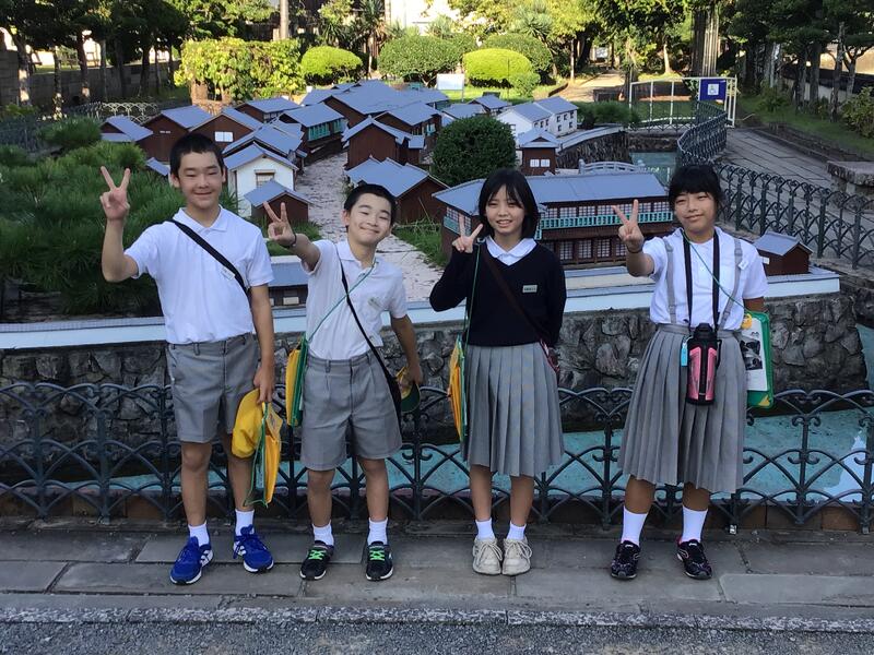 ミニチュア出島の前で班ごとに記念撮影をし、復元建物や展示物を見学しました。