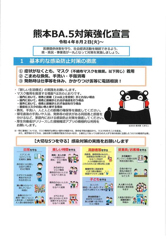 熊本県のホームページに、「熊本BA.5対策強化宣言」について掲載されていました。8月2日(火)から出されているものです。