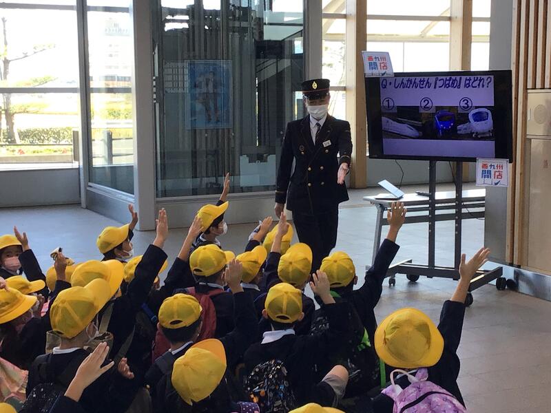 新玉名駅に到着した後すぐに駅長さんの新幹線クイズが始まりました。クイズが出るたびに、多くの手が上がり、「ハイ、ハイッ」と元気な声が響いていました。