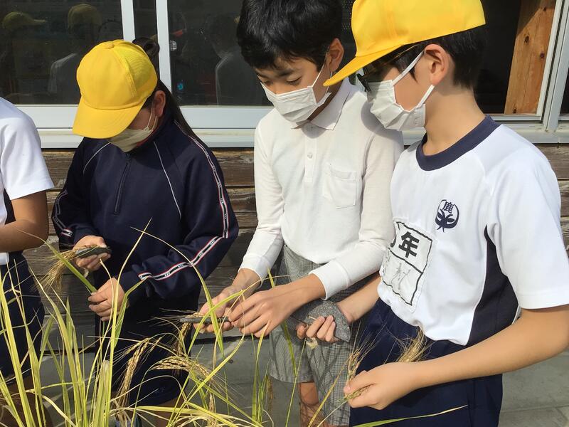 26日(水)は、まほろば保育園の年長さんと一緒に稲刈りを体験しましたが、5年生で初めて稲刈りをする子どもも多く、「楽しかったです。」「腰が痛くなりました。」「全部手作業ですると思うと、機械のありがたみを感じます。」「早く、食べたいです。」と話をしていました。