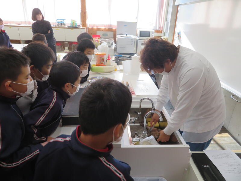 12月8日(木)に、2年生の「ワクワクお仕事体験」がありました。調理師をされている保護者の中島さんに来ていただき、丸鶏を解体するところを披露していただきました。丸鶏が解体され、段々とスーパーでよく目にするもも肉やささみの肉になっていきました。最後は、みんなでおいしい唐揚げをいただきました。「生き物」が「食べ物」に変わる様子から「命をいただく」ことを学ばせていただき、子どもたちにとって大変貴重な経験となりました。