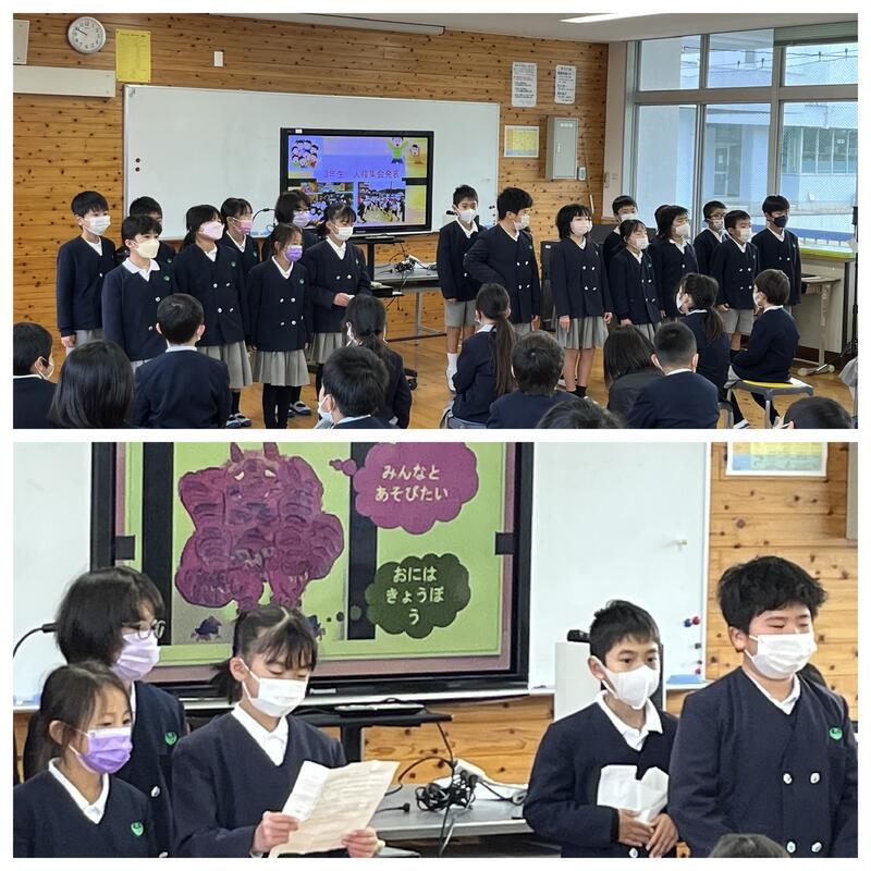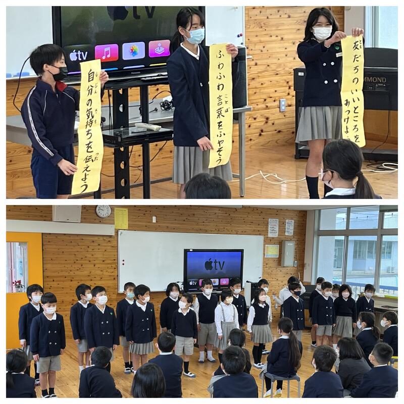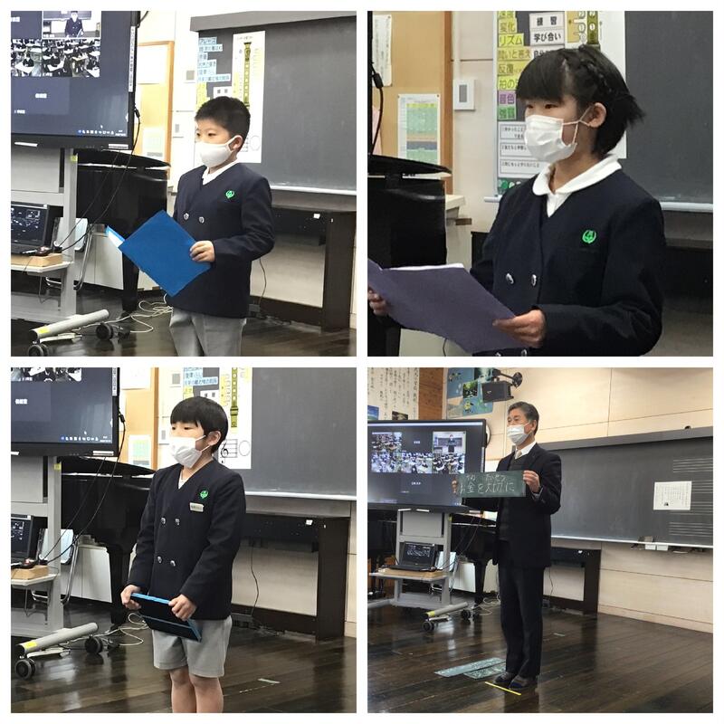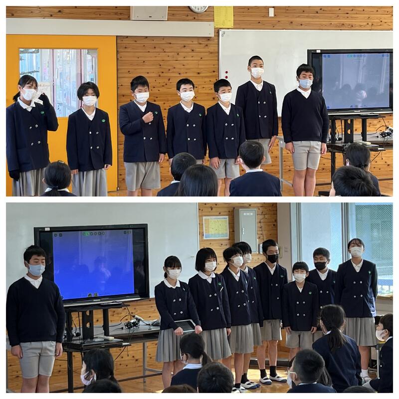 学年代表として2年中島りおさん、4年竹下そらさん、西田ゆうかさん、6年鬼塚なおとさんが発表をしました。2学期に頑張ったことと冬休みや3学期の目標について話してくれました。話す内容を全て暗記して堂々と発表する様子、聞いている人によく伝わるように目線を合わせながら話す様子など、とても素敵な発表でした。