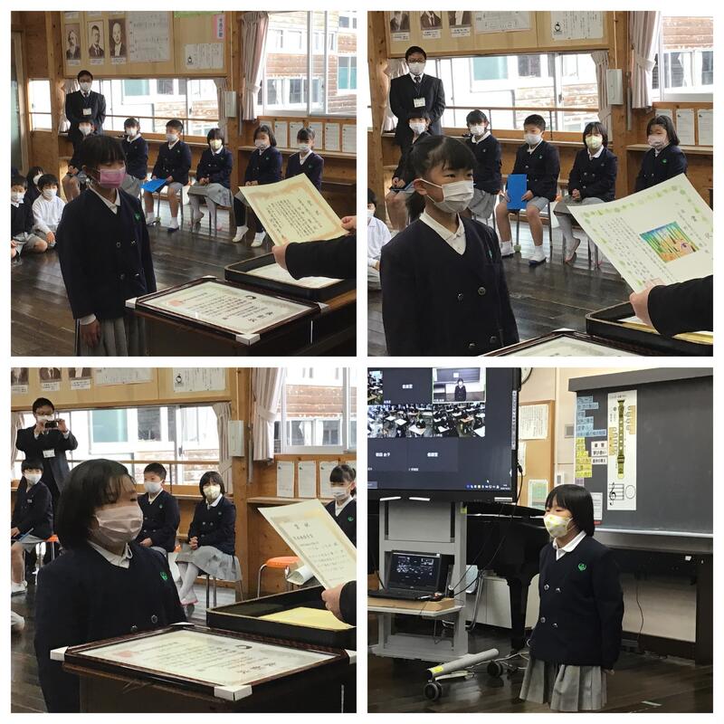 式が始まる前に、3年の田中そらさん、野中りこさん、2年の堤いちかさんの表彰がありました。緊張していたようですが、堂々と表彰を受けました。