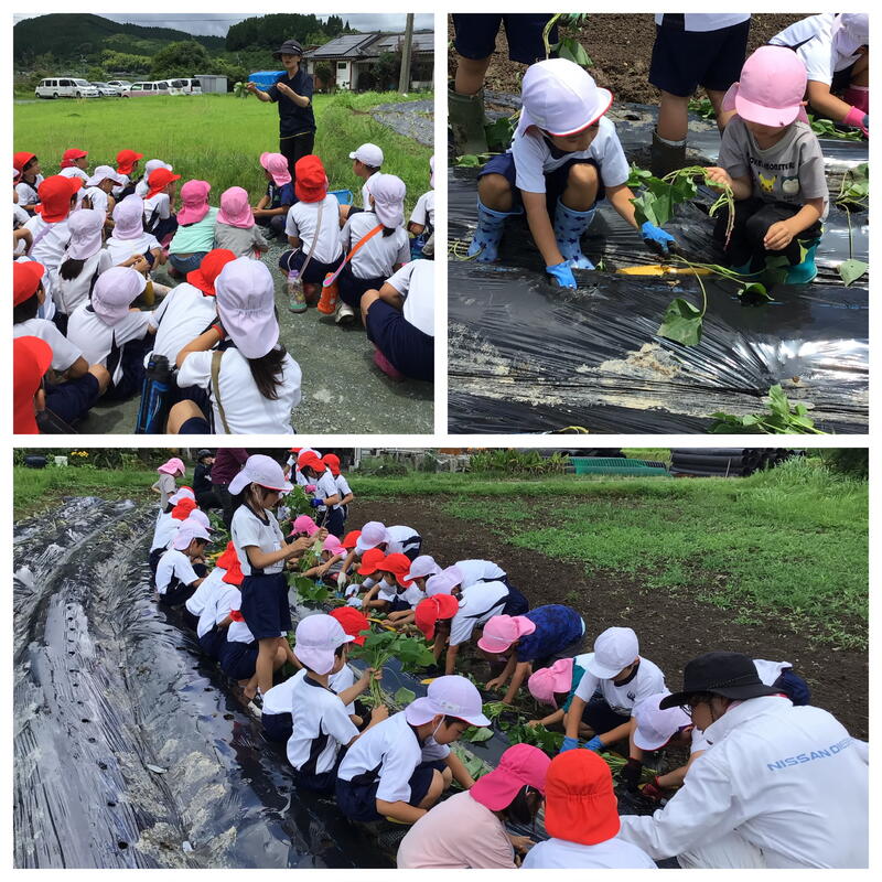 6月21日(金)梅雨の合間をぬって、1・2年生とまほろば保育園の年長さんとで、さつまいもの苗植えをしました。畑にはうねが作られ、マルチも張られて、苗を植える準備万端!ところが、前日までの雨で、畑がぬかるんでいたため、長靴を履いて畑に入った子どもたちが「足がぬけません」「ひっぱってください」と苗を植えた後は、先生方に引っ張ってもらって畑から無事に出てきたそうです。秋の芋ほりもきっと楽しいでしょう。大きなおいもが育つのが楽しみですね。