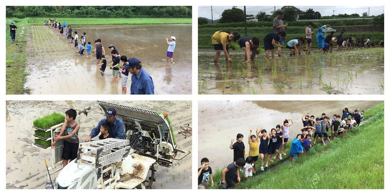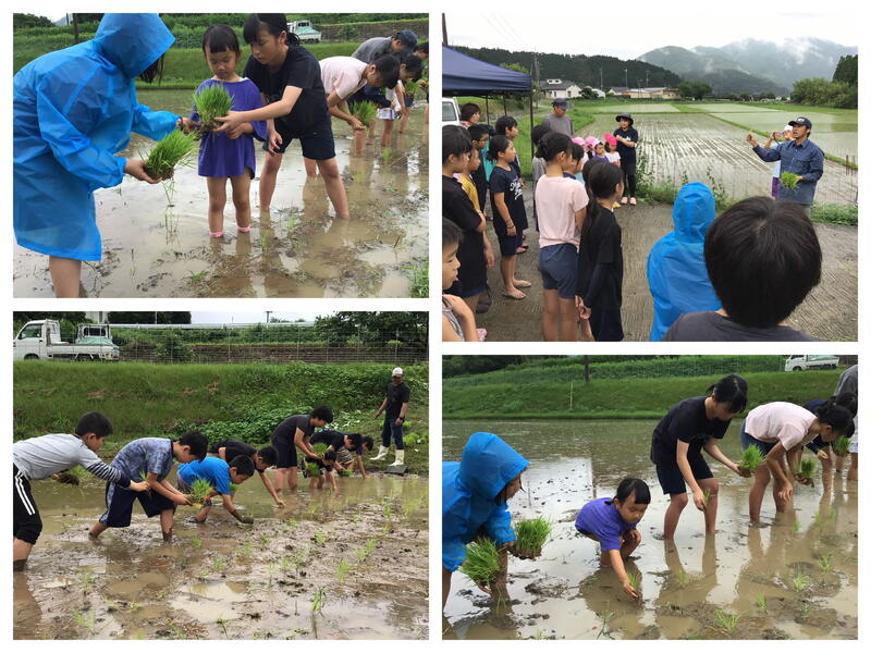 6月24日(月)5年生とまほろば保育園の年長さんとで今年も田植えを行うことができました。北原さんを始め、農業同志会の皆様に今年もお世話になりました。天気が心配されましたが、小雨が降る中、張り切って頑張る子どもたちの表情は、とても生き生きとしていました。苗の植え方を教わり、保育園の年長さんにも優しく教えながら、丁寧に植えていきました。最後は田植え機の登場です。広見地区の田んぼで、これからぐんぐん育っていくことでしょう。お忙しい中、お世話いただいた農業同志会の皆様、本当にありがとうございました。