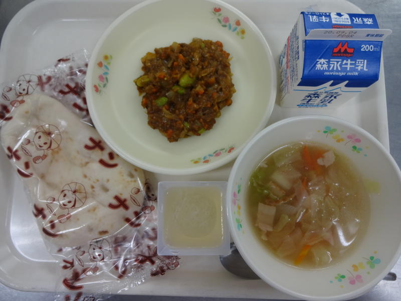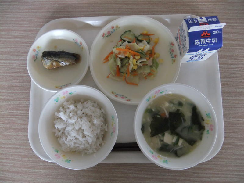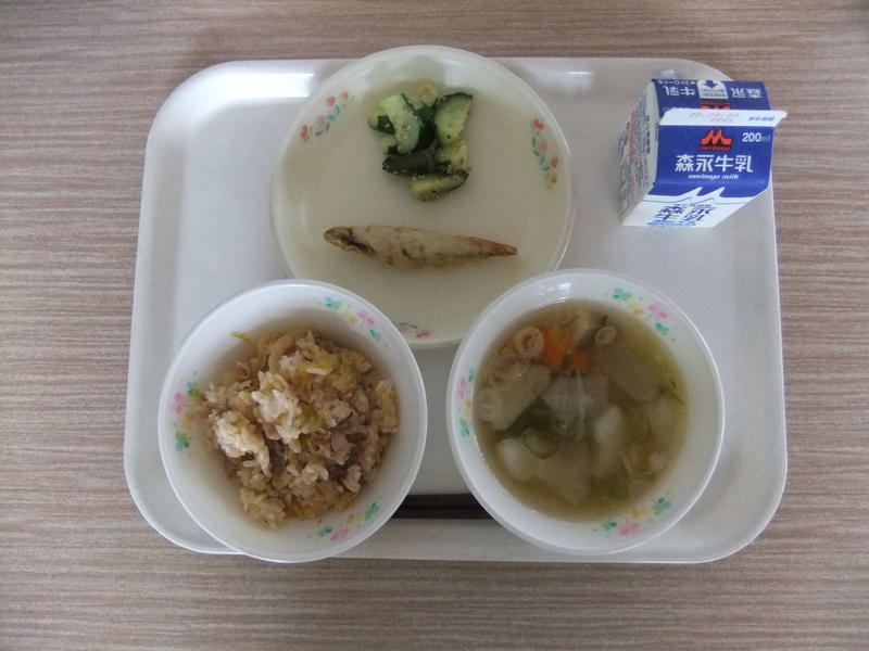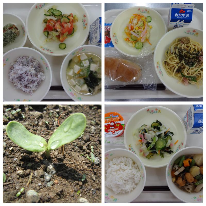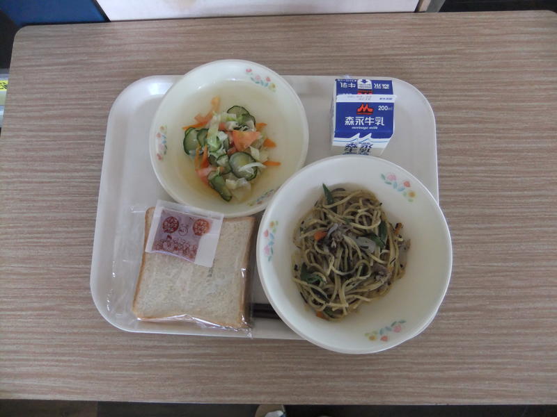 ひじきの入ったスパゲッティでした。サラダに入っていたちりめんじゃこは、カタクチイワシの稚魚を乾燥させたもので、カルシウムが多く含まれています。カルシウムは、骨の発達には欠かせない栄養素です。毎日の牛乳にも多く含まれています。