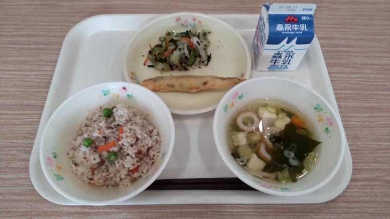 今日のピースそぼろご飯のグリンピースは、鹿北小1年生が豆をとり出してくれたものでした。鞘の端をつまんで少し開いてから豆をとる方法を教えましたが、なかなか上手くいかず苦戦していました。楽しかったようで、集めた豆をのぞき込んで「もっとやりたい」と言っていました。今日は甘辛く煮た挽肉と一緒に混ぜご飯にしたので、「おいしい」と喜んで食べていました。ぜひお試しください。