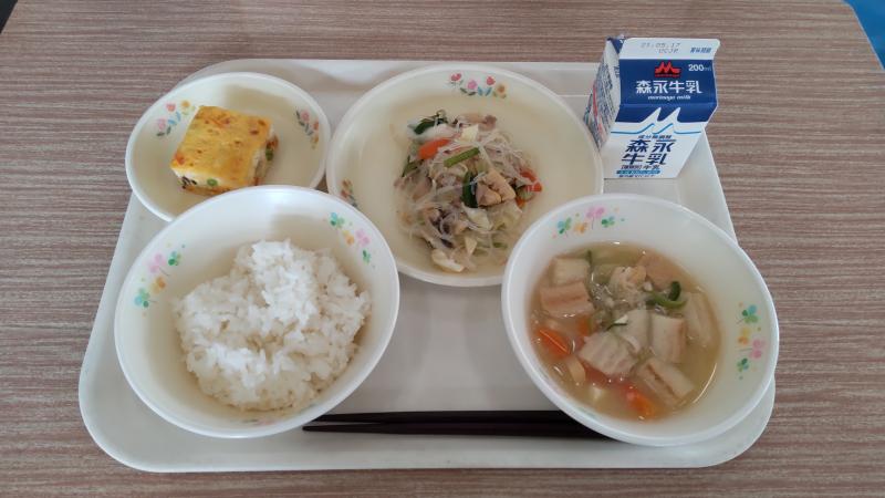 今日は手作り卵焼きでした。鶏のひき肉、干し椎茸、人参、枝豆を入れて蒸し焼きにしました。とてもボリュームがあり、おなかいっぱいになりました。副菜は春雨の入った野菜炒めでした。水に浸しておいた春雨を加えるだけですが、食べやすいようで毎回好評です。野菜がたっぷり食べられて、簡単に作れますので、ぜひ作ってみてください。
