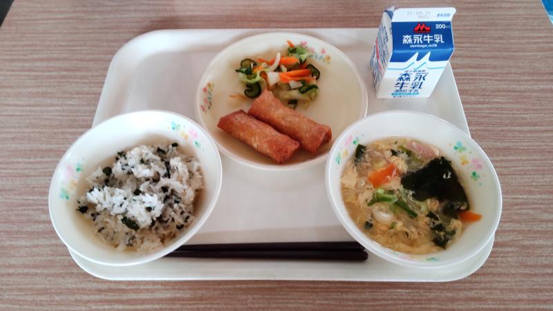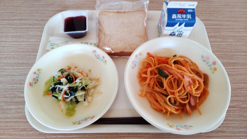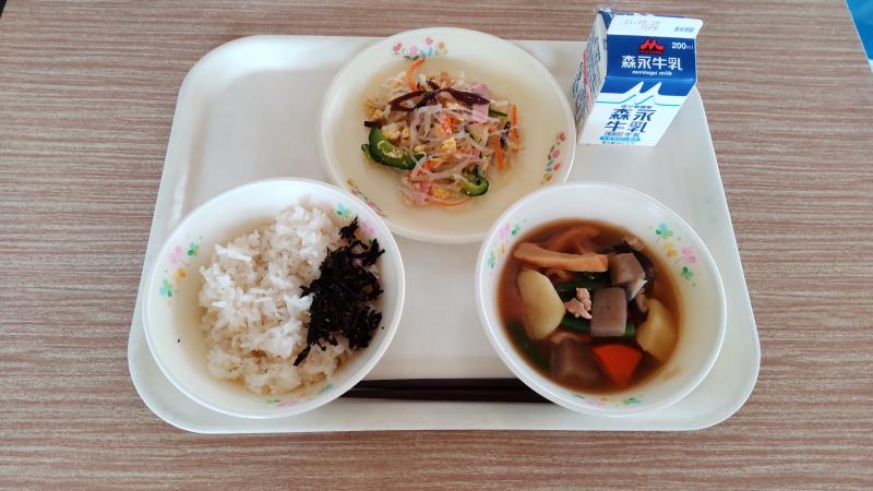 給食の献立は栄養価のほかに、地元食材、食文化、いろどり、噛みごたえ、旬、配食する食器、価格などを考えて立てています。皆さんはいかがでしょうか?今日は麺料理でボリュームがあるので、さっぱりとしたサラダとゼリーにしました。サラダには小魚、ごま、海藻を入れました。家庭で給食のようにたくさん種類の食材を使うのは大変だと思います。乾物、缶詰、レトルト、冷凍食品なども上手に利用して、おいしい料理を作り、楽しい食卓にしましょう。