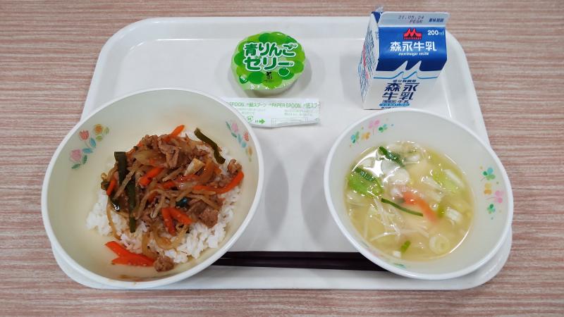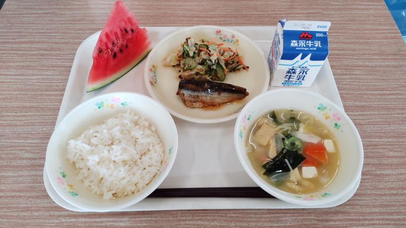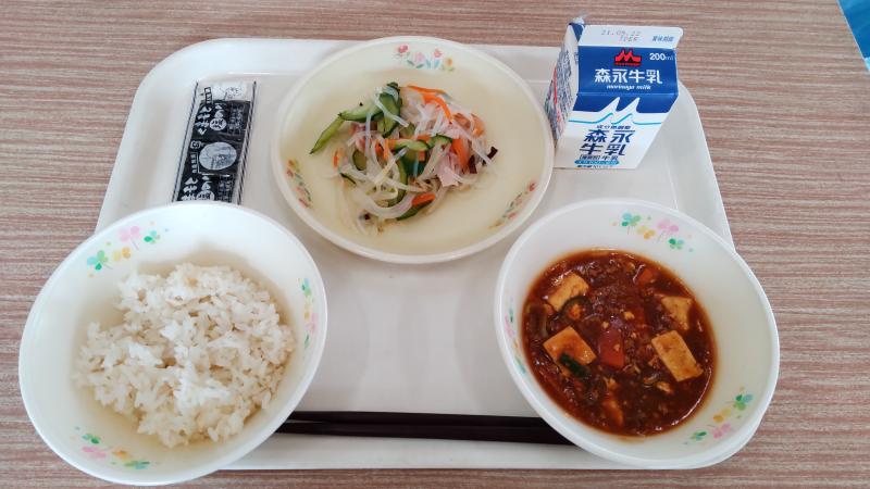 今日は新じゃがと新玉ねぎをたっぷり使った煮ものでした。今の時期はおいしい野菜や果物が豊富です。地場産物を出しているお店には、とうもろこし、にんじん、キャベツ、ごぼう、メロン等がたくさん並んでいます。今日のお昼の放送でも紹介しましたが、どれも柔らかく、甘味があり、食べたときにとてもいい香りがします。また、今日の手作りのふりかけは、ひじき、かつお節、ごま、しそご飯のもとで作りました。噛んだときに、それぞれの香りが口に広がり、ごはんが進みます。香りも楽しみながら食べてほしいと思います。