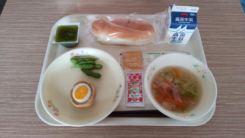 スコッチエッグ 一食ケチャップ 枝豆 りんごジャム