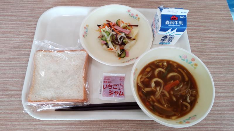 今日はうどんの具とサラダの野菜が、シャキシャキとした食感でおいしく仕上がったと思います。給食は家庭と違い、出来立てを食べられないので、どれも柔らかくなりがちです。調理の先生方の技術と経験で、今日もネギともやしの食感を残すことができました。ねぎは繊維を残すように斜め切りにし、もやしは水から茹でると食感が残りやすく、おいしく仕上がります。ぜひ、試してみてください。今日は先生からも「毎日カレーうどんでもいいです !」との声をいただき、本当にうれしくなりました。