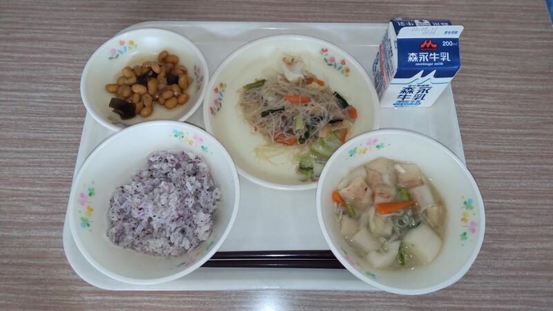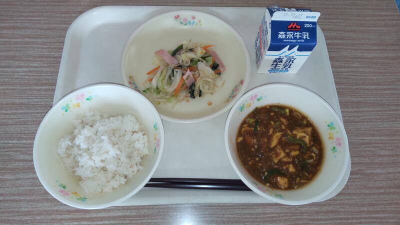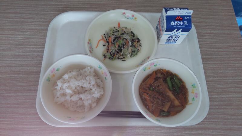 麻婆春雨は簡単そうに見えますが、意外と難しい料理です。春雨がどんどん水分を吸って膨らむので、味の濃さと春雨の硬さと全体量を適量に仕上げる調理員さんはさすがです。今回もちゅるっと食べやすい汁加減で子どもたちに好評でした。勘の良さと熟練の技、私も見習いたいと思います。
