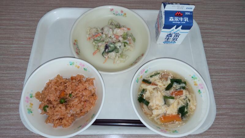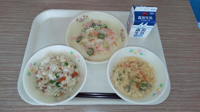 今日は炒めものは春キャべツや筍など、野菜をたっぷり使いました。春雨は酢の物やスープに使うことが多いと思いますが、給食では炒め物やマヨネーズ和えも人気があります。野菜もたくさん食べれます。ぜひ作ってみてください。