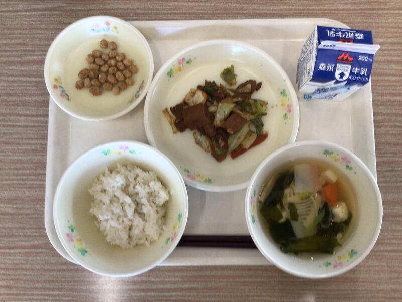 牛乳 むぎご飯 若竹汁 回鍋肉 黄粉大豆
