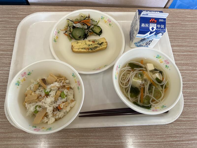 たけのこご飯 魚そうめん汁 千草焼き ひじき和え