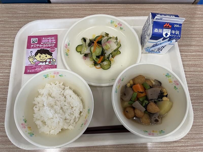 牛乳 むぎご飯 大豆の磯煮 和風サラダ すこやかふりかけ