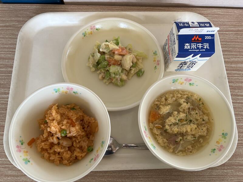 牛乳 チキンライス ふわふわ卵スープ ビーンズサラダ